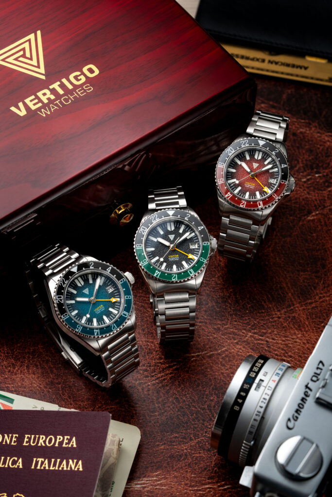 Vertigo annuncia il lancio del Viator GMT, un nuovo modello che sarà disponibile per il preordine dal 1° aprile 2025. Disponibile in tre varianti cromatiche, l’orologio sarà offerto a un prezzo speciale di 290 euro più spese di spedizione per tutto il mese di aprile. Ogni mese successivo, il prezzo del preordine subirà un incremento, fino al prezzo definitivo di listino di 480 euro più spese di spedizione, previsto una volta che il modello sarà disponibile in pronta consegna. Le prime consegne sono stimate per settembre 2025. Il Viator GMT presenta una cassa in acciaio inossidabile 316L dal diametro di 39 mm, con anse da 20 mm e una lunghezza lug-to-lug di 46 mm. La costruzione robusta include fondello e corona a vite, con un’impermeabilità garantita fino a 300 metri. Il fondello è decorato con una stampa a conio, mentre la ghiera girevole bidirezionale a 48 scatti è dotata di un inserto in vetro zaffiro bicolore con trattamento luminescente BGW9. Il quadrante a sandwich presenta indici, sfere e logo trattati anch’essi con Super-LumiNova BGW9 per una leggibilità ottimale anche al buio. La corona, personalizzata con il logo Vertigo, si abbina a una clasp anch’essa logata, dotata di un sistema di microregolazione rapida. Il Viator GMT verrà consegnato in un elegante cofanetto in legno laccato rosso, a sottolineare l’attenzione ai dettagli del marchio, come già avevamo visto in una precedente recensione qui su TOC