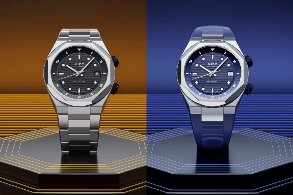 Mido presenta anche il Multifort 8 Two Crowns, un orologio sportivo con design integrato che segna l’ingresso del marchio in un segmento quantomeno affollato. La cassa in acciaio inossidabile misura 40 mm di diametro e soli 9,5 mm di spessore, garantendo un profilo sottile e compatto. L’impermeabilità è di 100 metri, mentre le due corone a vite, una a ore 4 per la regolazione dell’ora e una a ore 2 per l’anello interno con scala dei 60 minuti, aggiungono un tocco distintivo senza compromettere l’eleganza. Il design richiama modelli iconici del passato con una cassa tonneau e una lunetta ottagonale rialzata, caratterizzata da finiture sfaccettate. Il quadrante, disponibile in blu, nero o grigio, presenta un motivo a strisce sottili orizzontali e indici incavati che creano un effetto molto tridimensionale. Le lancette a bastone sono lucide e affusolate, con trattamento luminescente. L’anello girevole interno, regolabile tramite la corona dedicata, è dotato di una scala dei 60 minuti con numeri e indici incisi. Il movimento scelto è il calibro 72, basato sull’ETA A31.111, un’evoluzione dell’ETA 2892, e grazie al suo spessore contribuisce al profilo compatto dell’orologio. Il Multifort 8 Two Crowns è disponibile con un bracciale in acciaio integrato a 1.220 euro oppure con un cinturino in caucciù a 1.190 euro