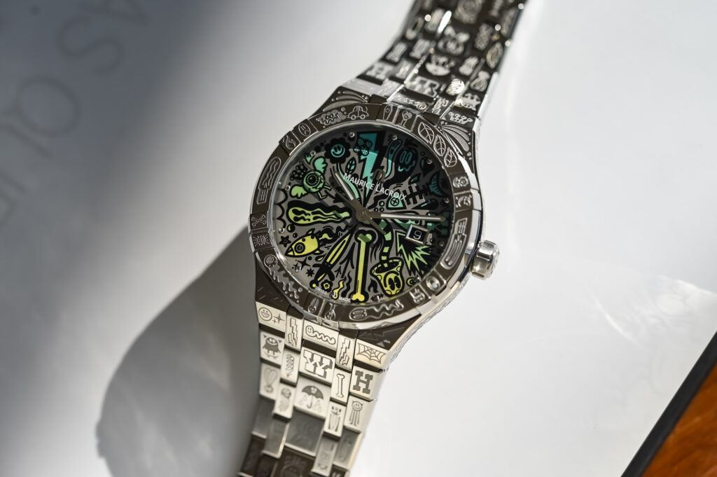 Maurice Lacroix presenta l’Aikon Automatic Wotto Limited Edition, un’edizione limitata a 1.000 pezzi che introduce un’estetica indubbiamente audace e artistica nella linea Aikon. Forse troppo audace. Questo modello nasce dalla collaborazione con l’artista britannico Craig Watkins, noto come Wotto, celebre per il suo stile di illustrazione caotico e surreale ispirato alla street art. Il design si distingue per la cassa in acciaio da 42 mm completamente incisa con motivi unici, tra cui funghi, cuori, fantasmi su skateboard e fulmini, che si estendono sulla lunetta e sul bracciale integrato, creando un effetto visivo ricco di dettagli. Il quadrante segue lo stesso approccio espressivo, presentando una serie di personaggi colorati in una gradazione che va dal giallo al blu su uno sfondo grigio. Gli indici sono ridotti al minimo, con semplici punte metalliche che non disturbano la composizione artistica. La finestra della data è incorniciata e il disco è nero, per mantenere il contrasto con il resto del design. All’interno dell’orologio batte il calibro ML115, basato sul Sellita SW200-1, e il fondello in vetro zaffiro permette di osservarlo. L’Aikon Automatic Wotto è già disponibile presso i rivenditori ufficiali in 1000 pezzi al prezzo di circa 3.000 euro.
