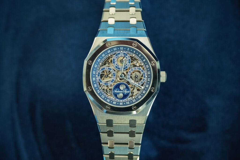 Audemars Piguet celebra il suo 150° anniversario con il nuovo Royal Oak Perpetual Calendar Openworked, un’edizione limitata a 150 esemplari. Il modello presenta una cassa in titanio da 41 mm con spessore di 9,9 mm e una lunetta realizzata in Bulk Metallic Glass (BMG), una lega a base di palladio con elevate proprietà di resistenza, ma non all’acqua, perché è solo un 20 metri. Il quadrante è in zaffiro trasparente e mostra il movimento scheletrato, con una lunetta interna in ottone blu che ospita l’indicazione del numero della settimana. Il layout del calendario perpetuo rimane quello tradizionale: mese e anno bisestile a ore 12, data a ore 3, giorno della settimana a ore 9 e fase lunare a ore 6. Il cuore dell’orologio è il calibro 5135, una versione scheletrata del calibro 5134, derivato da Jaeger-LeCoultre e ora in fase di dismissione. Un dettaglio tecnico interessante è la massa oscillante scheletrata, montata su una guida periferica con rulli di rubino per ridurre l’attrito e migliorare la durata nel tempo. Il Royal Oak Perpetual Calendar Openworked 150th Anniversary è dotato di un bracciale in titanio con maglie centrali in BMG. Sarà disponibile in soli 150 esemplari al prezzo di 175.000 CHF.