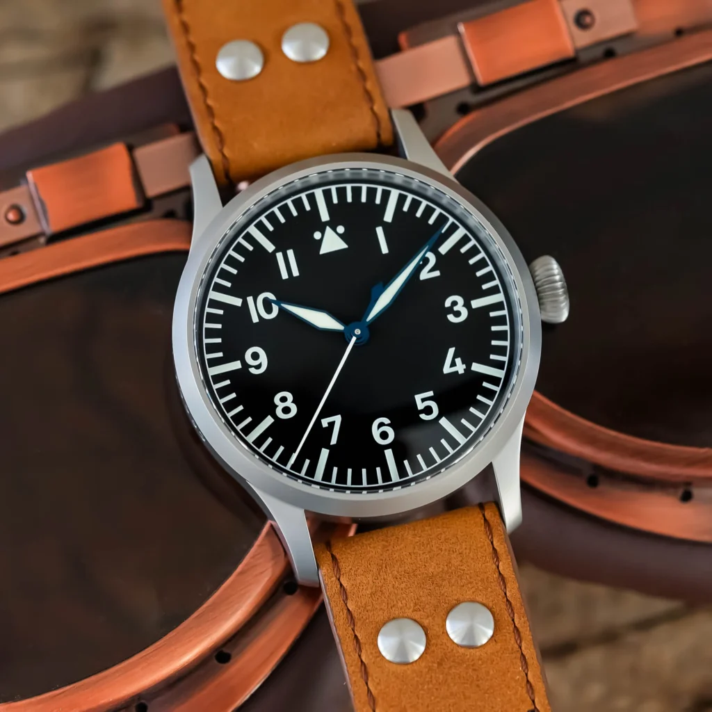 Stowa ha presentato il Flieger Original, una fedele riedizione del suo storico orologio da pilota B-Uhr prodotto negli anni ’40. La cassa in acciaio inossidabile misura 42 mm di diametro e 13,5 mm di spessore, con una finitura extra-opaca ottenuta tramite sabbiatura. Il quadrante nero opaco segue il design originale di tipo A, con numeri arabi grandi e una minuteria periferica, garantendo un’ottima leggibilità, come si conviene a un vero Pilot. Una caratteristica distintiva di questo modello è l’uso del movimento Unitas 6498-1 modificato internamente da Stowa per avere i secondi centrali, anziché i piccoli secondi. Questa modifica richiede l’aggiunta di un nuovo ingranaggio e di un ponte ridisegnato, aumentando il numero di rubini da 17 a 18. Il movimento, visibile attraverso il fondello in vetro zaffiro, presenta finiture di alta qualità, tra cui strisce radianti, viti azzurrate e ponti con finitura anglage. Il Flieger Original è disponibile in tre versioni: due con cinturini in pelle rivettata (marrone o nero) e una con bracciale in acciaio tipo Milanese. Il prezzo? Non è quello dei soliti Stowa super interessanti e altrettanto economici che potete trovare anche su Amazon. In questo caso è di poco superiore ai 3.000 euro.
