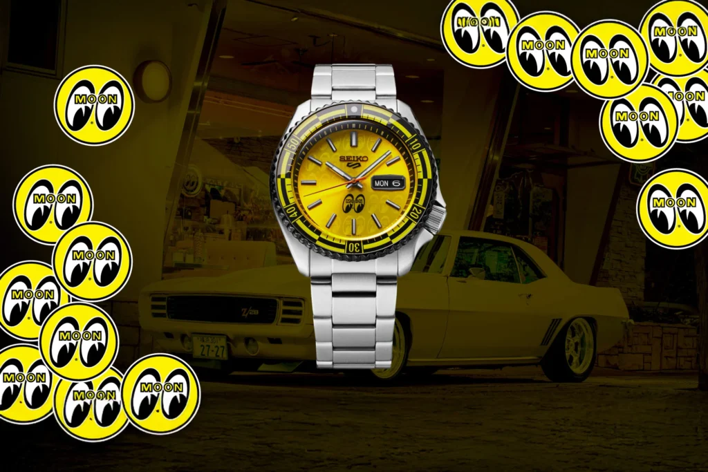 Seiko presenta il Seiko 5 Sports Mooneyes Limited Edition, un modello in collaborazione con il marchio giapponese Mooneyes, noto nella cultura hot rod e custom. Basato sulla serie Seiko 5 Sports SKX, l’orologio mantiene le caratteristiche di robustezza e versatilità tipiche della collezione. La cassa in acciaio inossidabile ha un diametro di 42,5 mm, una lunghezza da ansa a ansa di 46 mm e uno spessore di 13,4 mm, con una finitura spazzolata e dettagli lucidi. La corona è posizionata a ore 4 con protezioni laterali e il vetro è in Hardlex. L’impermeabilità è garantita fino a 100 metri. La lunetta girevole unidirezionale ha un inserto acrilico trasparente con scala dei 60 minuti stampata sul retro, richiamando il design degli strumenti da cruscotto vintage. Il quadrante è giallo brillante con una finitura spazzolata e un pattern decorativo trasparente con il logo Mooneyes. Gli indici applicati sono abbinati a una finestra giorno-data con cornice metallica, mentre le lancette hanno una forma ispirata agli anni Settanta e sono trattate con Lumibrite per garantire la leggibilità in condizioni di scarsa illuminazione. Il fondello in vetro minerale giallo mostra il movimento e presenta il logo Mooneyes inciso. Il calibro utilizzato è il Seiko 4R36 con funzione di stop dei secondi. L’orologio è fornito con un bracciale in acciaio spazzolato a tre maglie con chiusura deployante e un secondo cinturino in nylon giallo e nero con il logo Mooneyes. La confezione speciale richiama il mondo dei garage d’epoca e delle corse hot rod. L’edizione è limitata a 1.500 esemplari e sarà disponibile da maggio 2025 al prezzo di 450 euro.