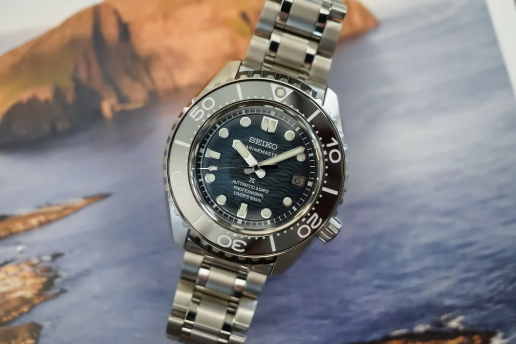 - Il Seiko Prospex Marinemaster Professional SLA081 rende omaggio al primo orologio subacqueo del marchio del 1965 con una costruzione moderna e prestazioni elevate. La cassa è una monoblocco in titanio che misura 45,3 mm di diametro e spessore di 16mm, e offre un’impermeabilità fino a 600 metri. La lunetta è in acciaio nero con scala graduata a contrasto, mentre il quadrante blu con motivo ondulato richiama l’ambiente marino. Il movimento è il calibro Seiko 8L35, un automatico con 72 ore di riserva di carica. Questa edizione limitata a 600 esemplari sarà disponibile a un prezzo di 5.200 euro.