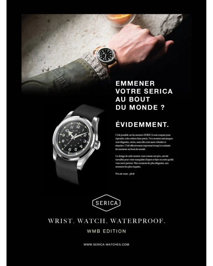 Il primo modello, la W.W.W. (Wrist Watch Waterproof), è un omaggio dichiarato agli orologi militari forniti all’esercito britannico durante la Seconda guerra mondiale. Cassa compatta, quadrante pulito, numeri chiari. E soprattutto: niente logo. Una scelta audace per un debutto, che mette subito in chiaro la visione del marchio. Serica non vuole vendere un’immagine: vuole offrire uno strumento. La W.W.W. era animata da un movimento a carica manuale e, nella sua sobrietà, già lasciava intuire quanto il marchio fosse attento alla coerenza storica e all’usabilità quotidiana.