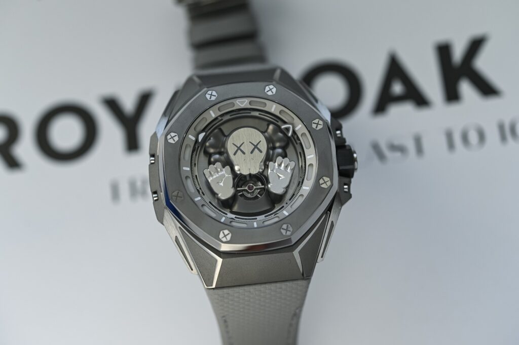 Audemars Piguet ha collaborato con l’artista contemporaneo KAWS per creare il Royal Oak Concept Tourbillon “Companion”, un’edizione limitata di 250 esemplari che fonde arte e alta orologeria. La cassa in titanio da 43 mm presenta una combinazione di finiture sabbiate, satinate e lucidate, conferendo un aspetto moderno e sofisticato. La lunetta e il fondello, fissati con otto viti esagonali, mostrano il caratteristico motivo a “X” di KAWS. La corona in ceramica nera completa il design. Il quadrante è dominato dalla figura tridimensionale del “Companion” di KAWS, realizzata interamente in titanio e posizionata al centro. Per mettere in risalto questa figura, l’indicazione dell’ora è stata spostata all’esterno del quadrante, con lancette che seguono una scala circolare sui bordi. Il tourbillon è visibile a ore 6, integrato nel petto del “Companion”, richiamando la serie “Dissected” dell’artista.