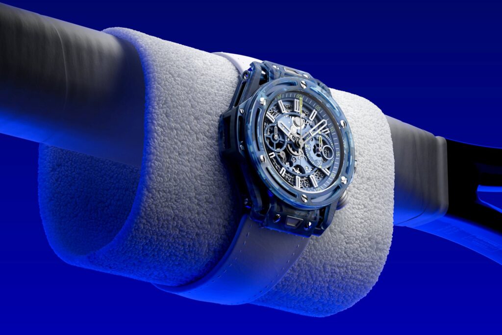 Hublot ha presentato il Big Bang Unico Novak Djokovic, un’edizione speciale che celebra la collaborazione con il celebre tennista serbo. Ma non è la solita collaborazione! Questo orologio si distingue per l’uso innovativo di materiali riciclati provenienti dall’attrezzatura personale di Djokovic, sottolineando l’impegno del marchio verso la sostenibilità. La cassa da 42 mm, con uno spessore di 14,5mm, è realizzata in un composito blu opaco ottenuto da una combinazione di resina epossidica, polvere di quarzo e fibre di vetro, integrando frammenti di 25 racchette HEAD e 32 magliette Lacoste (17 blu scuro e 15 azzurre) utilizzate da Djokovic durante la stagione 2023. Per ridurre il peso complessivo, Hublot ha sostituito il tradizionale vetro zaffiro con un Gorilla Glass temperato e ha utilizzato alluminio anodizzato per corona, pulsanti e fondello, conferendo all’orologio una leggerezza di soli 49,5 grammi, più leggero di una pallina da tennis!