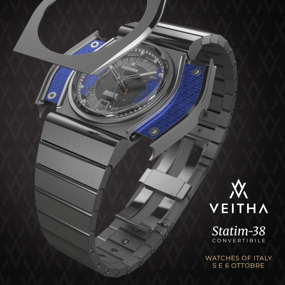 Il microbrand italiano Veitha ha lanciato un orologio molto particolare, si tratta dello Statim-38 Convertibile. Il nome scelto per questo modello non è casuale. Un po’ come accadeva con le sportive degli anni 70 infatti, anche lo Statim-38 può cambiare aspetto grazie ai sistemi brevettati da Veitha che consentono di modificarne quadrante e cover senza necessità di smontaggio. E anche i bracciali, a scelta tra acciaio a maglie elastiche, pelle o gomma tutti con microregolazione – oltre agli adattatori per cinturini aftermarket – potranno essere sostituiti velocemente grazie allo sgancio rapido. Il tutto in una elegante cassa da 38,6mm di diametro, soli 37,6mm di lug to lug e 11,5mm di spessore. Un nuovo concetto di orologeria da polso che riporta la mente agli anni ’90, quando forse tutto era più semplice e il concetto di poter convertire un accessorio, come anche un orologio, dominava il design. Attualmente lo Statim-38 Convertibile è in fase di prototipazione e arriverà sul mercato nel 2025.