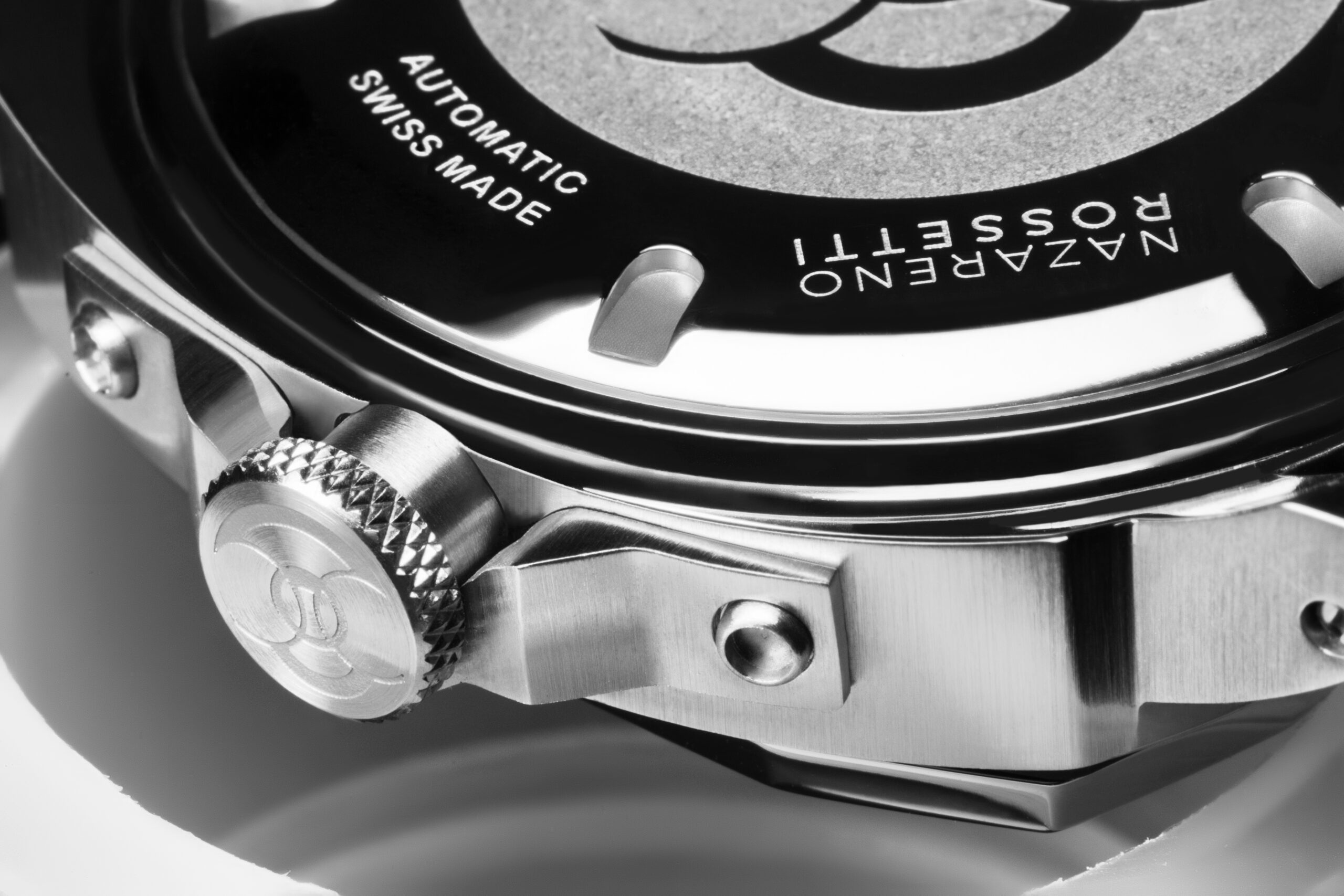 L’acciaio chiaro incastona e protegge il vetro zaffiro lenticolare che racchiude il doppio quadrante garantendo una visibilità perfetta da ogni angolazione, caratteristica unica del design del Nazareno Rossetti.