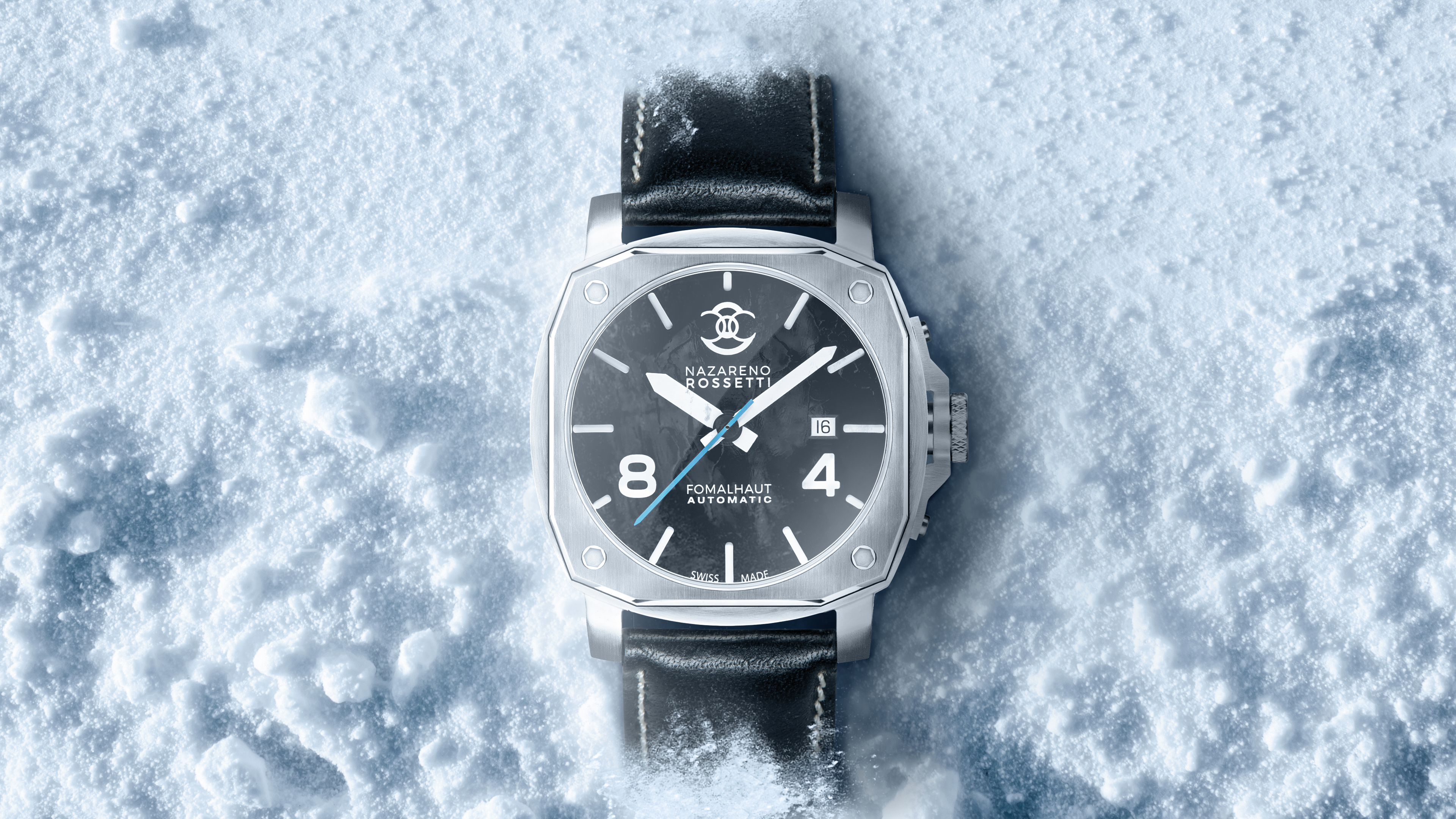 La stagione più rigida ed elegante viene rappresentata dal Nazareno Rossetti versione Bright Winter, il bianco della neve incontra lo scuro delle montagne sul quadrante di questo orologio.