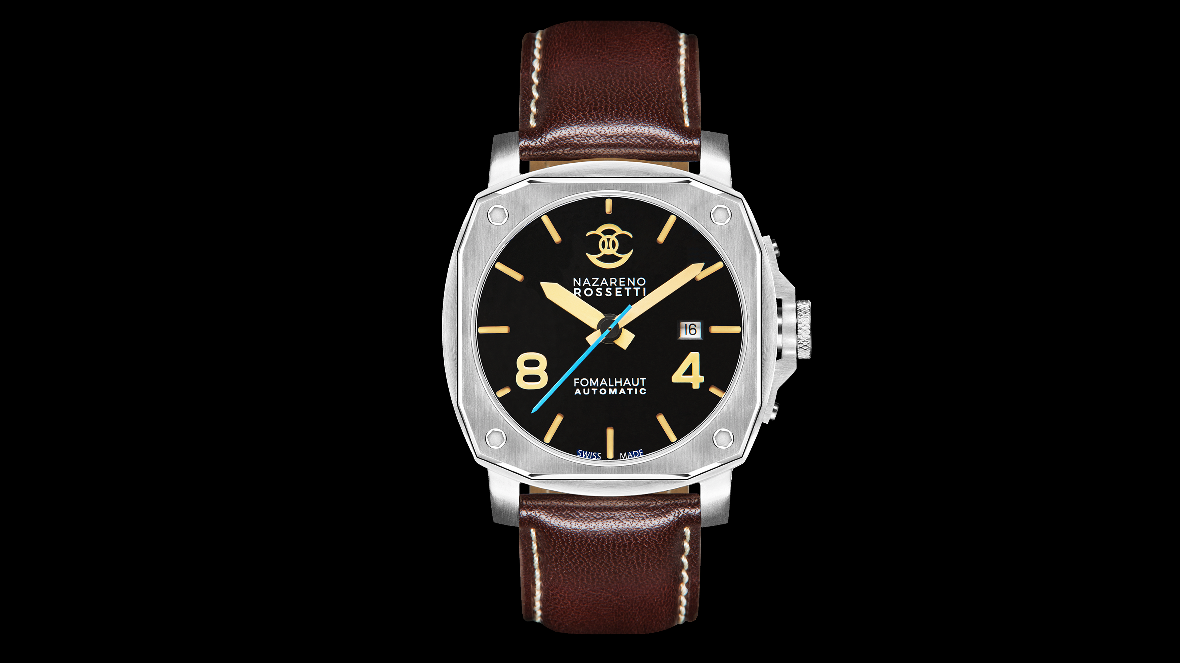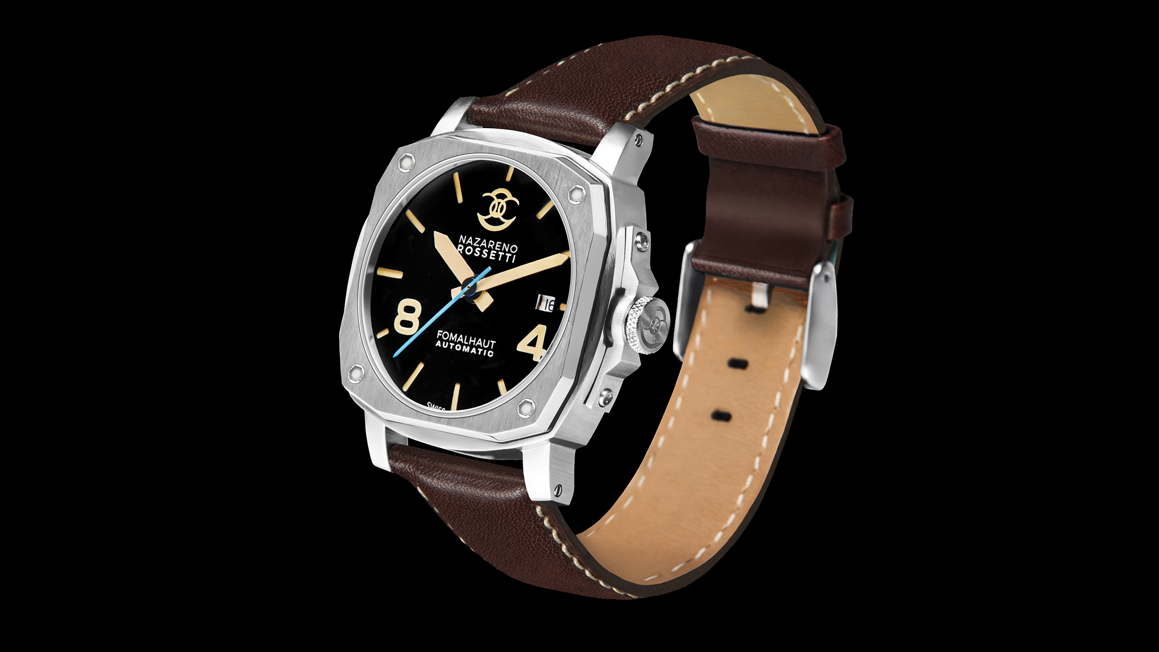 Movimento: Automatico Cal. P224 Swiss Made, customizzato per Nazareno Rossetti su base Peseux, spessore 4,6mm, 28 rubini, 28’800 oscillazioni/ora, riserva di carica 41 ore