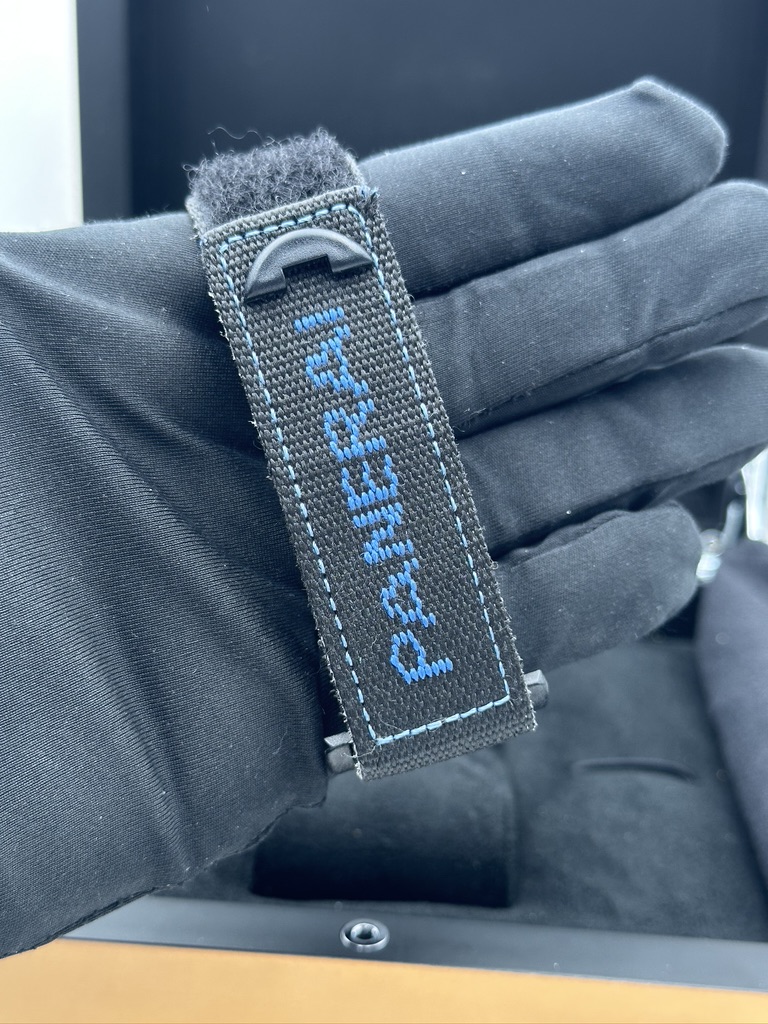L’OROLOGIO PRESENTATO E DOTATO DI UN CINTURINO IN VELCRO NERO ORIGINALE PANERAI E UN CINTURINO IN PELLE NERO.