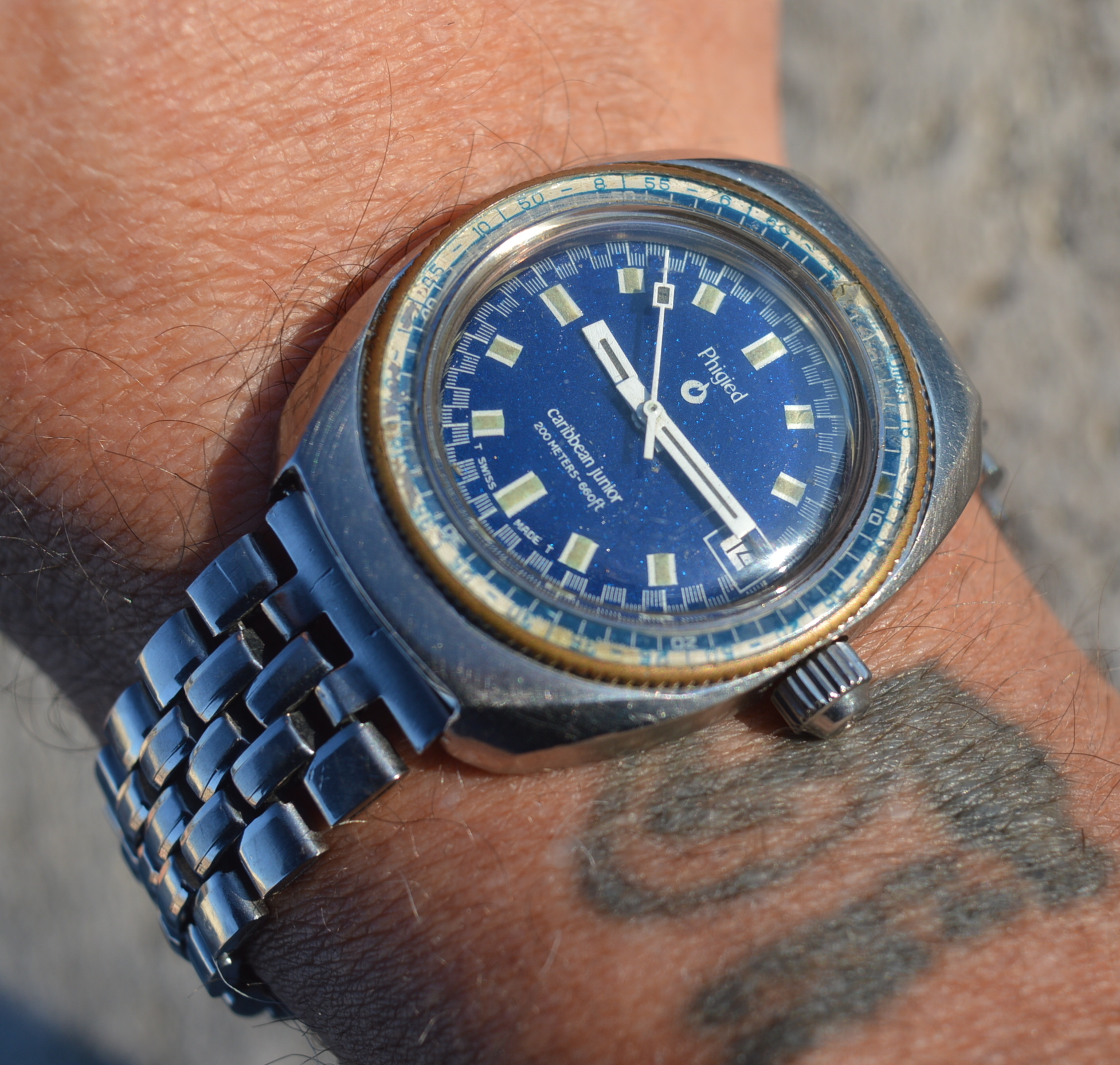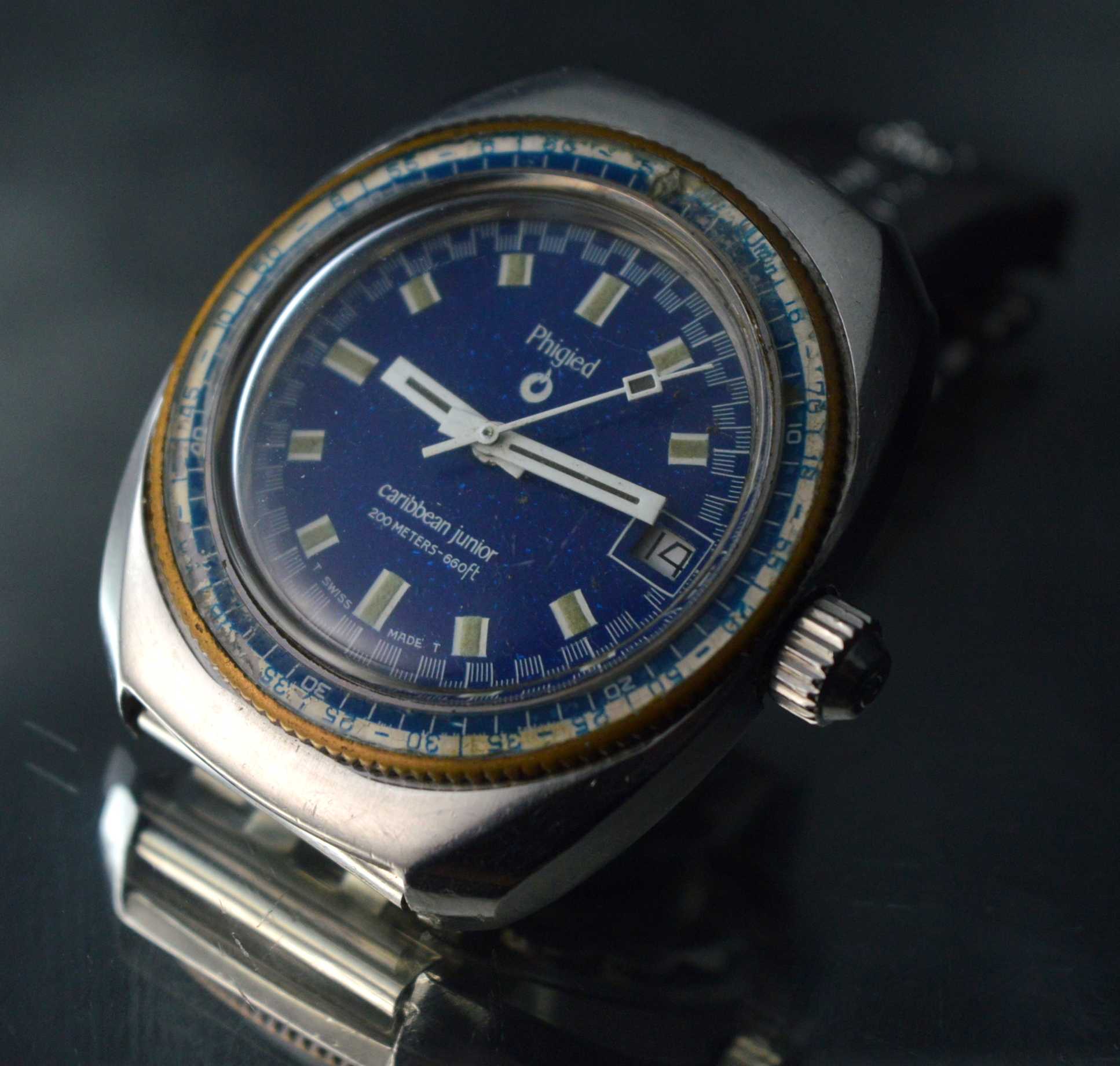 PHIGIED CARIBBEAN RARE MEN’S “JUNIOR” 200MT STAINLESS STEEL DIVER BAKELITE BEZEL