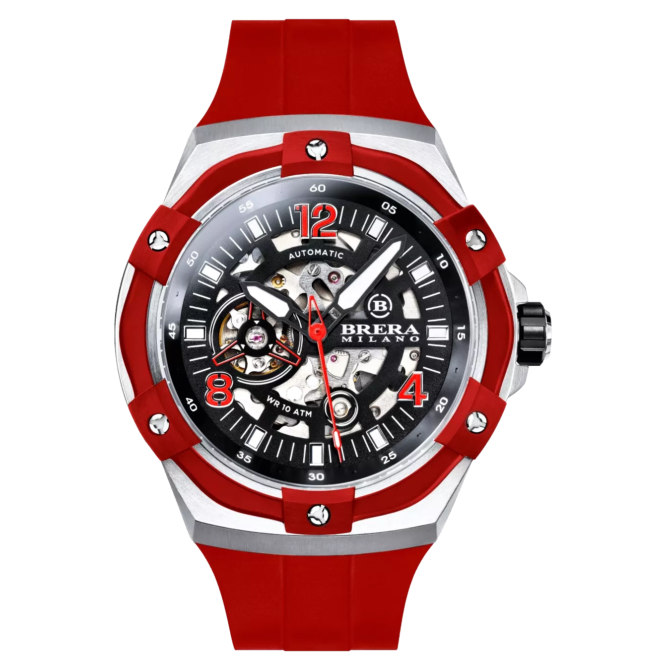 CASSA: Acciaio Inox (316L) – Spazzolata DIMENSIONE CASSA: Ø45 mm – H 13.45 mm CORONA: Acciaio Inox (316L) Ø7.5 mm – Chiusura a Vite GHIERA: Alluminio IP Rosso – Intercambiabile con viti disegno Brera CRISTALLO: Zaffiro Antiriflesso QUADRANTE: Semi scheletrato Multilivello con Indici luminescenti applicati [:en] CASE: Stainless Steel (316L) – Brushed CASE SIZE: Ø45 mm – H 13.45 mm CROWN: Stainless Steel (316L) Ø7.5 mm – Screw-Down Crown System BEZEL: Aluminum Red IP – Interchangeable with Brera screws CRYSTAL: Antireflective Sapphire DIAL: Multilevel semi skeleton with applied luminescent Indexes [:] |