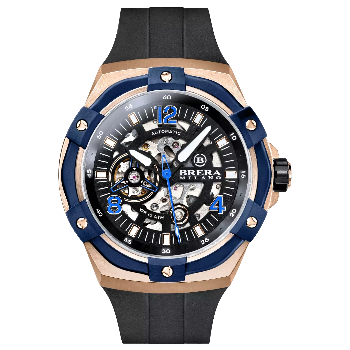 CASSA: Acciaio Inox (316L) – Spazzolata – IP Oro Rosa DIMENSIONE CASSA: Ø45 mm – H 13.45 mm CORONA: Acciaio Inox (316L) Ø7.5 mm – Chiusura a Vite GHIERA: Alluminio IP Blu – Intercambiabile con viti disegno Brera CRISTALLO: Zaffiro Antiriflesso QUADRANTE: Semi scheletrato Multilivello con Indici luminescenti applicati [:en] CASE: Stainless Steel (316L) – Brushed – Rose Gold IP CASE SIZE: Ø45 mm – H 13.45 mm CROWN: Stainless Steel (316L) Ø7.5 mm – Screw-Down Crown System BEZEL: Aluminum Blue IP – Interchangeable with Brera screws CRYSTAL: Antireflective Sapphire DIAL: Multilevel semi skeleton with applied luminescent Indexes [:] |