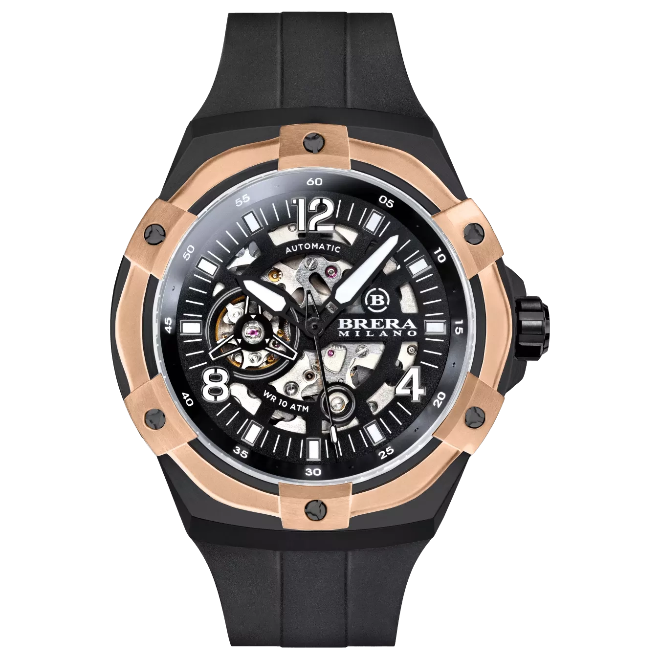 CASE: Stainless Steel (316L) – Brushed – Black IP CASE SIZE: Ø45 mm – H 13.45 mm CROWN: Stainless Steel (316L) Ø7.5 mm – Screw-Down Crown System BEZEL: Stainless Steel (316L) Rose Gold IP – Interchangeable with Brera screws CRYSTAL: Antireflective Sapphire DIAL: Multilevel semi skeleton with applied luminescent Indexes
