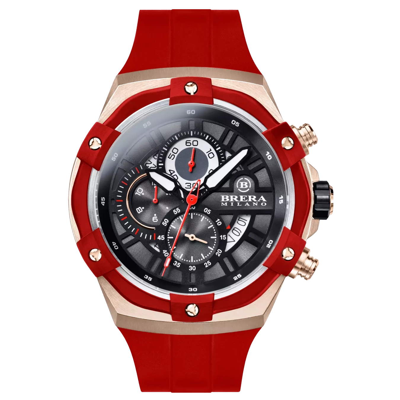 CASSA: Acciaio Inox (316L) – Spazzolata – IP Oro Rosa DIMENSIONE CASSA: Ø45 mm – H 13.45 mm CORONA: Acciaio Inox (316L) Ø7.5 mm – Chiusura a Vite GHIERA: Alluminio IP Rosso – Intercambiabile con viti disegno Brera CRISTALLO: Zaffiro Antiriflesso QUADRANTE: Multilivello [:en] CASE: Stainless Steel (316L) – Brushed – Rose Gold IP CASE SIZE: Ø45 mm – H 13.45 mm CROWN: Stainless Steel (316L) Ø7.5 mm – Screw-Down Crown System BEZEL: Aluminum Red IP – Interchangeable with Brera screws CRYSTAL: Antireflective Sapphire DIAL: Multilevel