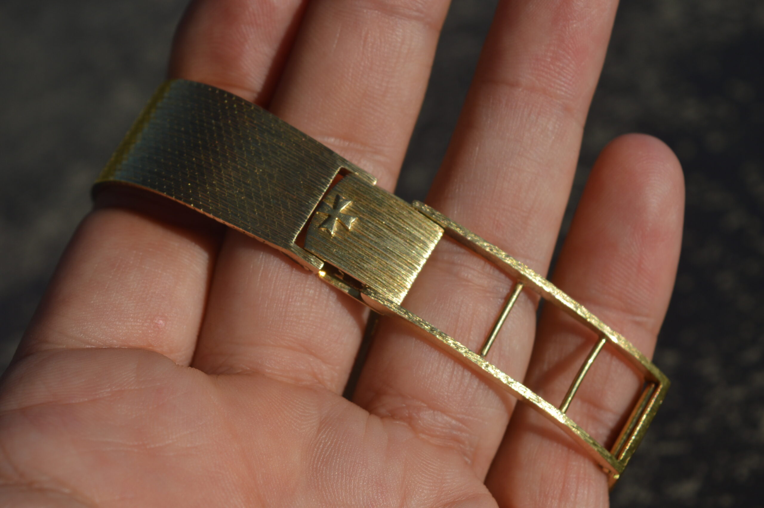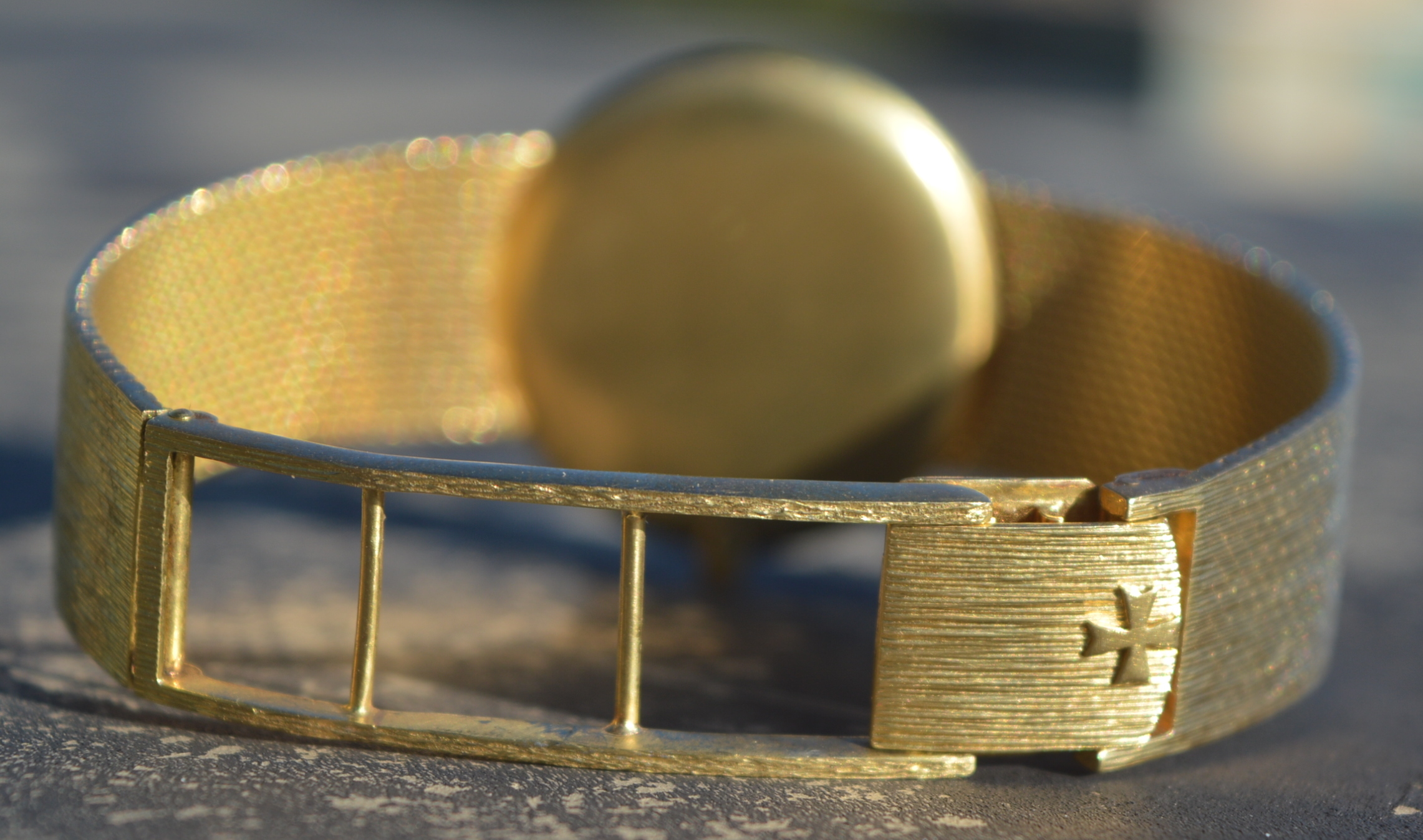 L’orologio è dotato di un bracciale originale integrato in oro giallo a trama fine con croce di Malta, il motivo del marchio, sulla chiusura.