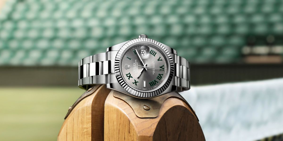 Non stupisce che Rolex abbia associato alla collaborazione un orologio: così come fece per Le Mans, Rolex ha creato una versione dedicata al torneo del DateJust 41. La specifica esclusiva al torneo la si può notare – assieme alla finitura soleil, identitaria del brand – sui numeri romani del quadrante, i quali mostrano un contorno verde acceso che richiama il campo di Wimbledon, unico nel suo genere anche per essere il solo dello “Slam” giocato sull’erba.