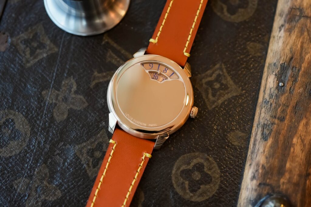Il Louis Vuitton Tambour Convergence è un omaggio moderno alle “montres à guichet” dell’era Art Déco, reinterpretando questo concetto con un design elegante e sottile. L’elegante cassa, ridisegnata rispetto al classico profilo Tambour, presenta un diametro di 37 mm e uno spessore di soli 8 mm, con anse scolpite separatamente e una finitura che combina superfici lucide e micro-sabbiature. Il quadrante chiuso ospita due finestre arcuate nella parte superiore, attraverso le quali si leggono le ore e i minuti tramite dischi rotanti sottostanti; le ore scorrono in senso orario nella finestra superiore, mentre i minuti occupano l’arco inferiore, con un losanga dorata o in platino, a seconda del modello, a indicare l’ora esatta. Il movimento automatico interno, calibro con alcune parti di manifattura LFT MA01.01, è dotato di un rotore centrale in oro 18k, bilanciere a inerzia variabile e una riserva di carica di 45 ore. Sono disponibili due versioni: una in oro rosa 18k con dischi abbinati e cinturino in pelle di vitello color cammello, e un’altra in platino 950, impreziosita da ben 795 diamanti con taglio “snow-set”, dischi rodiati e cinturino in pelle di vitello blu. Il prezzo per la versione in oro è di 37.500 euro, mentre quella in platino con diamanti, a differenza di quanto si possa credere, è proposta a soli 68.500 euro.