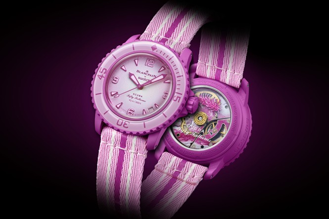 Il nuovo Swatch x Blancpain Scuba Fifty Fathoms Pink Ocean è una collaborazione tra Swatch e Blancpain che reinterpreta l’iconico orologio subacqueo Fifty Fathoms in una veste completamente rosa. La cassa in bioceramica misura 42,3 mm di diametro ed è caratterizzata da una tonalità di rosa satura, quasi magenta, estesa anche alla cornice della lunetta, alla corona e al fondello. La lunetta unidirezionale presenta un inserto in resina rosa chiaro con scala dei 60 minuti in una tonalità di rosa più scura, arricchita da Super-LumiNova per una migliore visibilità. Il quadrante sfumato rosa con finitura granulosa ospita indici applicati e numeri arabi, mentre le lancette e le varie iscrizioni sono anch’esse in rosa scuro; persino il disco della data è in tinta rosa. L’orologio è alimentato dal movimento automatico Sistem51, composto da 51 componenti, che batte a una frequenza di 21.600 alternanze all’ora e offre una riserva di carica di 90 ore. Il fondello trasparente permette di vedere il rotore decorato con motivi acquatici rosa e l’immagine del nudibranco Ceratodoris rosacea. Completano il design un cinturino NATO rosa realizzato con reti da pesca riciclate e una fibbia in bioceramica rosa. Disponibile dal 1º febbraio presso selezionati negozi Swatch, questo modello non è in edizione limitata ed è proposto al prezzo di 400 euro.