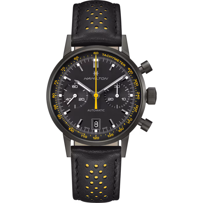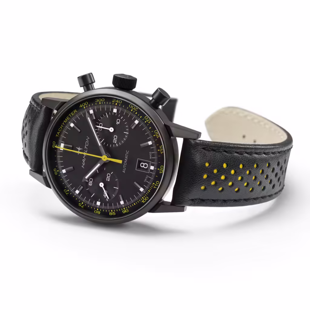L’ultima incarnazione di questa tensione verso il dinamismo è la nuova versione completamente nera dell’Hamilton Intra-Matic Auto Chrono, un’interpretazione in chiave moderna e aggressiva di un classico anni ’60 che già da tempo gode di grande favore tra gli appassionati. Con il suo design heritage reinterpretato in nero totale — dal quadrante al cinturino, fino alla cassa trattata PVD — l’Intra-Matic si reinventa senza perdere la memoria. Ecco allora che non parliamo solo di un cronografo, ma di un ponte narrativo tra il passato e un futuro che ha imparato a guardarsi indietro per correre più forte.