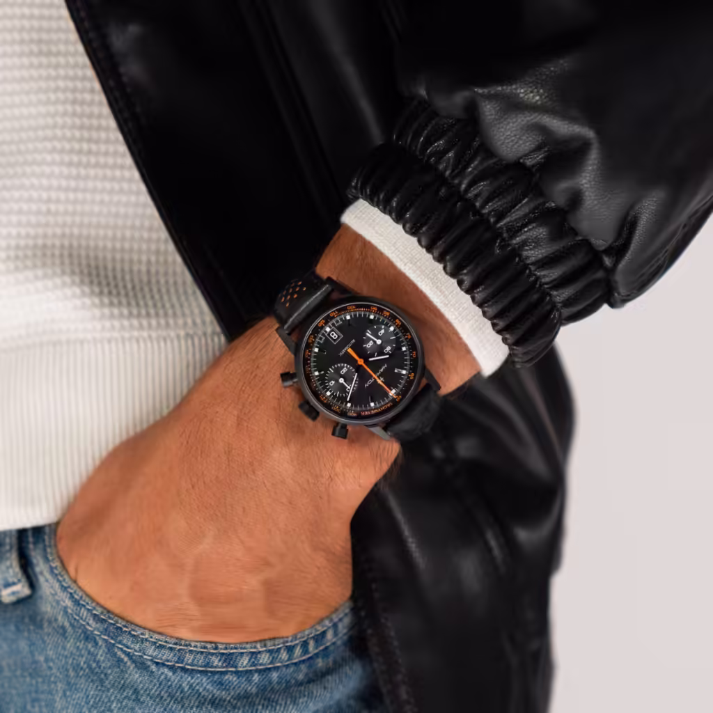 La nuova serie All Black dell’Intra-Matic Auto Chrono abbandona i contrasti grafici dei panda dial e sceglie il total black come linguaggio espressivo. Quadrante, indici, lancette, cassa e cinturino: tutto è immerso in un nero opaco, profondo e tecnico. È un linguaggio che parla direttamente al mondo delle corse anni ’70, al mondo delle muscle cars, delle piste illuminate dai fari notturni, delle corse clandestine. Ma anche al presente di un collezionismo che ha riscoperto la passione per l’orologeria “racing” con connotati più aggressivi e contemporanei.