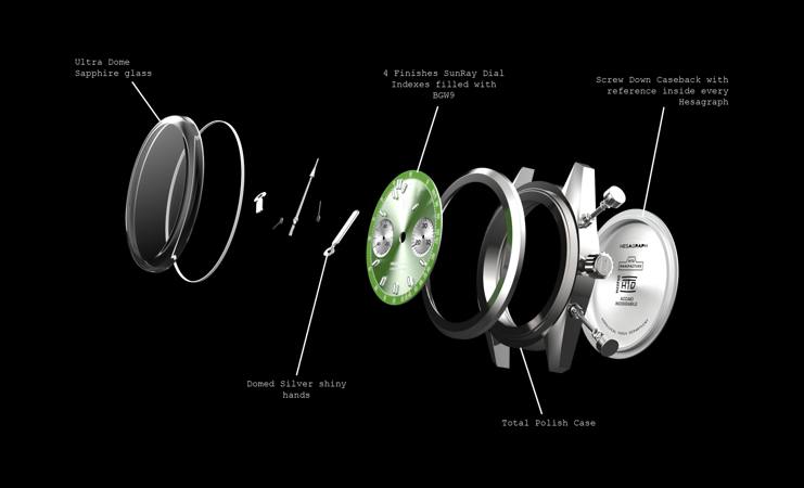 “Hesagraph” e l’indicazione della carica manuale. Gli indici e le sfere sono un omaggio alle forme