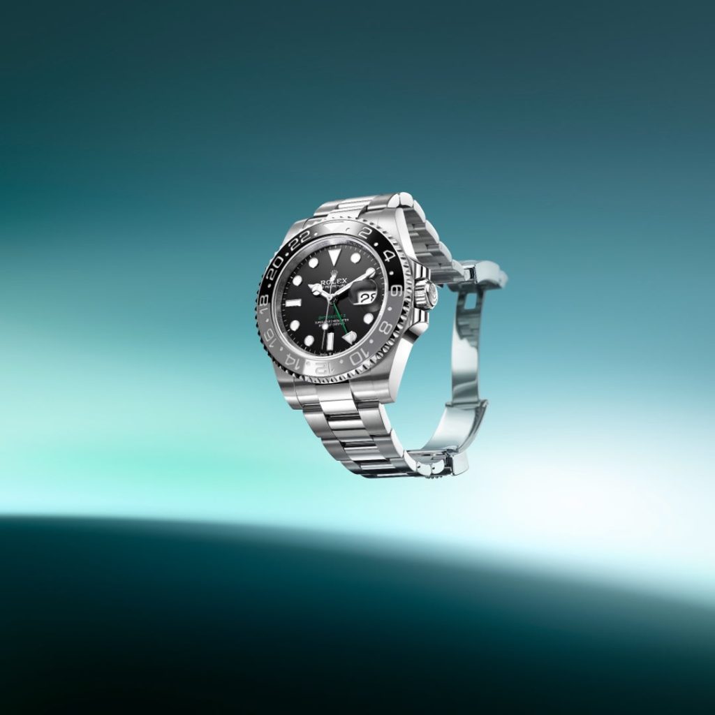 Entriamo a gamba tesa su quello che forse è stato il modello più discusso del 2023, il Rolex GMT Master II. Sotto la lente di ingrandimento, o sarebbe il caso di dire “sotto la lente ciclopica”, si è ritrovato il Pepsi, il mitico e ambito da tanti collezionisti Rolex GMT con lunetta blu e rossa. Secondo molti questo modello sarebbe andato fuori produzione per problemi relativi alla produzione della lunetta, ma Rolex per il momento lo lascia a catalogo, aggiungendo una nuova versione. Vediamo, infatti, il GMT-Master II in acciaio con il disco della lunetta in ceramica Cerachrom grigia e nera, già presentato lo scorso anno ma sulla versione acciaio e oro. La lancetta delle 24 ore verde ricorda vecchi modelli di GMT, garantendo un’alta leggibilità, come anche le graduazioni e i numeri scavati che vengono colorati mediante il deposito di platino, rendendoli particolarmente visibili.