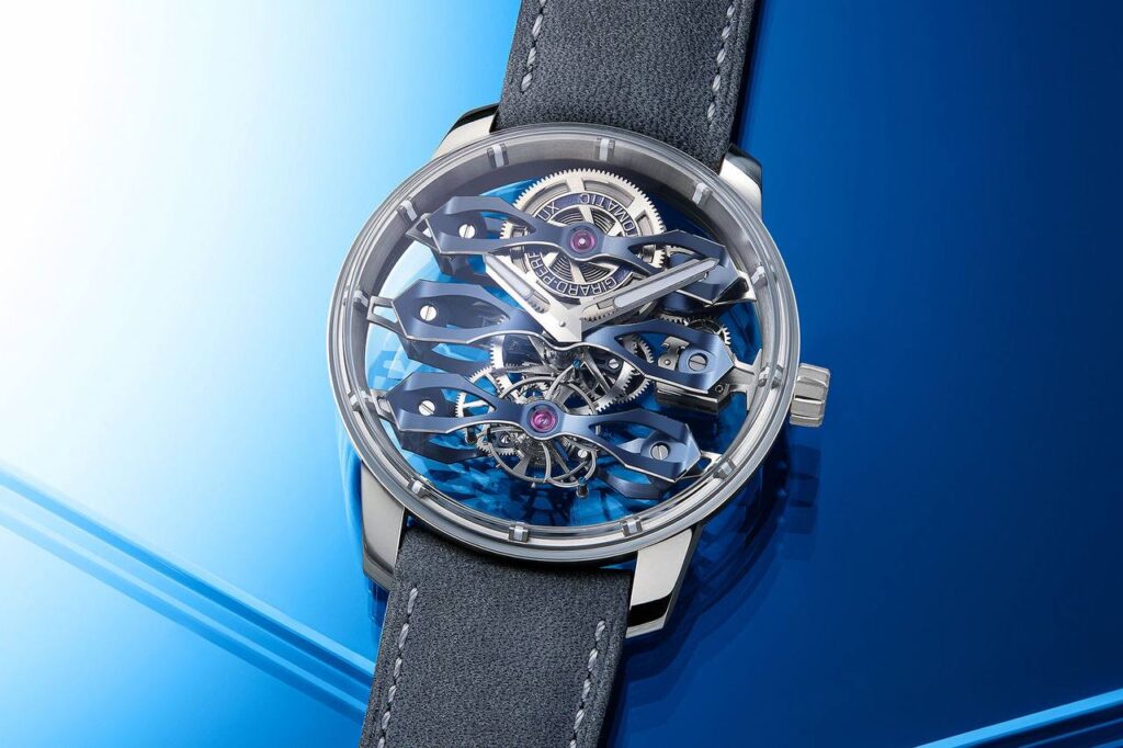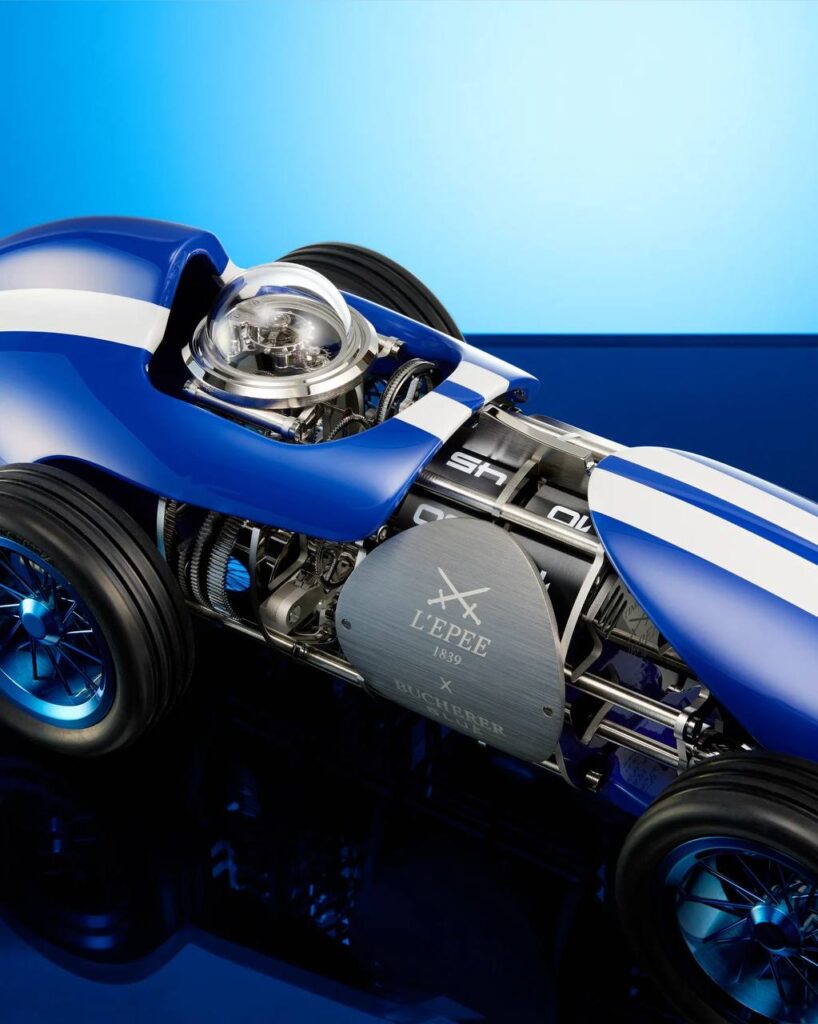 Il blu, come il nome del progetto della gioielleria, è il colore predominante nelle sue edizioni limitate. Tra le più recenti spicca quella con Girard-Perregaux, uno scheletrato Tourbillon con tre ponti di colore blu, sopra le righe. Un’altra collaborazione esilarante è quella sorta con L’Epée 1839, dando vita a un orologio da tavolo con le forme di un’auto da corsa degli anni ’50. Il motore meccanico dell’orologio si carica come una macchinina giocattolo, alimentando il motore con un movimento a più livelli montato sulla splendida monoposto blu.