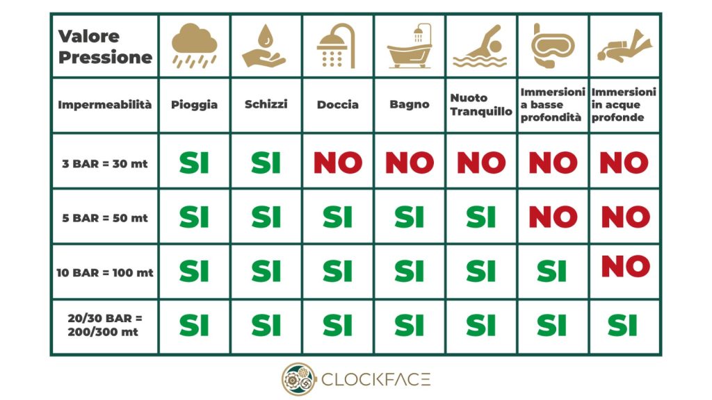 Contrariamente a quanto molti pensano, un orologio subacqueo può essere resistente anche a “soli” 100 metri di immersione marina, a seconda dell’uso ma l’impermeabilità dichiarata verrà sempre testata al 125%. Il 25% in più è frutto di un calcolo matematico che considera il movimento dinamico del subacqueo che andrà necessariamente ad aggiungere pressione ulteriore alla cassa rispetto all’indicazione di resistenza ottenuta lasciandola ferma in profondità.