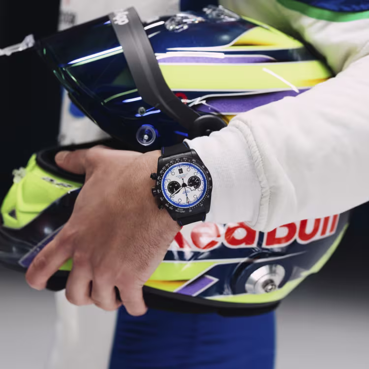 Il quadrante bianco, concettualmente ripreso dalla livrea 2025 del team Visa Cash App Racing Bulls (VCARB), ospita due contatori – di 45 minuti e piccoli secondi – realizzati anch’essi in fibra di carbonio . Le lancette “snowflake” in Super‑LumiNova e la scala tachimetrica incisa nel carbonio evidenziano l’anima sportiva, mentre gli accenti blu richiamano il design F1.