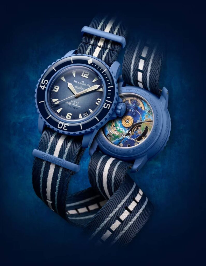 Sul podio, a guidare la classifica dei marchi svizzeri con maggior fatturato, come nel 2021, ci sono Rolex, Cartier e Omega. Ma quello che ha fatto scalpore sono stati i dati straordinari indicati dallo Swiss Watch Industry Report che ha registrato un aumento del fatturato del 50% di Swatch rispetto all’anno precedente. Numeri che in casa Swatch non si vedevano da anni, complice l’uscita dei MoonSwatch presentati nel marzo 2022, i dati non mentono, oltre un milione di pezzi venduti. Un orologio che ha avvicinato moltissimi “curiosi” al mondo dell’orologeria, che grazie alla sua frizzantezza, ai suoi colori sgargianti, al suo design iconico, alla storia dietro lo Speedmaster Moonwatch e ad un prezzo molto competitivo, ha destato molto clamore. Il gruppo Swatch ci ha voluto provare di nuovo, presentando i Bioceramic Scuba Fifty Fathoms, in collaborazione con Blancpain, il marchio registrato di orologeria più antico al mondo, fondato in Svizzera, a Villeret, nel 1735; nonostante questo, la manifattura più antica a non aver mai interrotto la propria produzione è Vacheron Constantin, fondata vent’anni dopo. Nel 1992 si è aggregata allo Swatch Group, che a distanza di trent’anni ha voluto esaltare il modello più iconico della Maison di Villeret, presentando cinque varianti di questi Scuba in bioceramica. L’orologio in questione è il Fifty Fathoms, da sempre protagonista di un 1 VS 1 con il Rolex Submariner, contendendosi il primato di diver più antico. Benché il primo orologio resistente all’acqua fosse il Rolex Oyster, presentato nel 1926, utilizzato dalla nuotatrice Mercedes Gleitze durante la traversata della Manica, non possiamo parlare di diver puro, in quanto non presentava tutte le caratteristiche di un vero e proprio orologio da immersione: molto resistente all’acqua, di facile lettura, dotato di una ghiera girevole e di un bracciale solido. L’anno di svolta per i diver fu il 1953, quando nacque il Rolex Submariner e probabilmente anche il Fifty Fathoms, anche se da una recente ricerca e approfondita pare che il vero anno di nascita sia stato il 1955. Non è ben chiaro quale dei due sia nato prima e in questo articolo non affronteremo la quaestio che riguarda i diver delle due manifatture, ma ciò che riguarda la recente collaborazione tra Blancpain e Swatch.